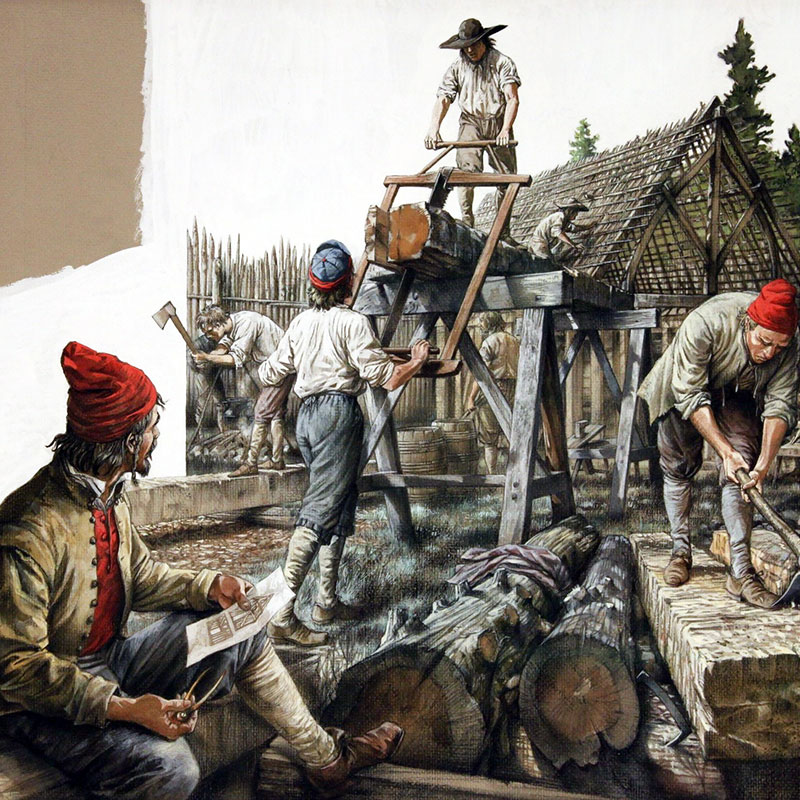 Montréal, été 1642 (Francis Back, Canada, 1991, Encre, gouache et crayons sur carton, Collection du Musée des Hospitalières de l’Hôtel-Dieu de Montréal)