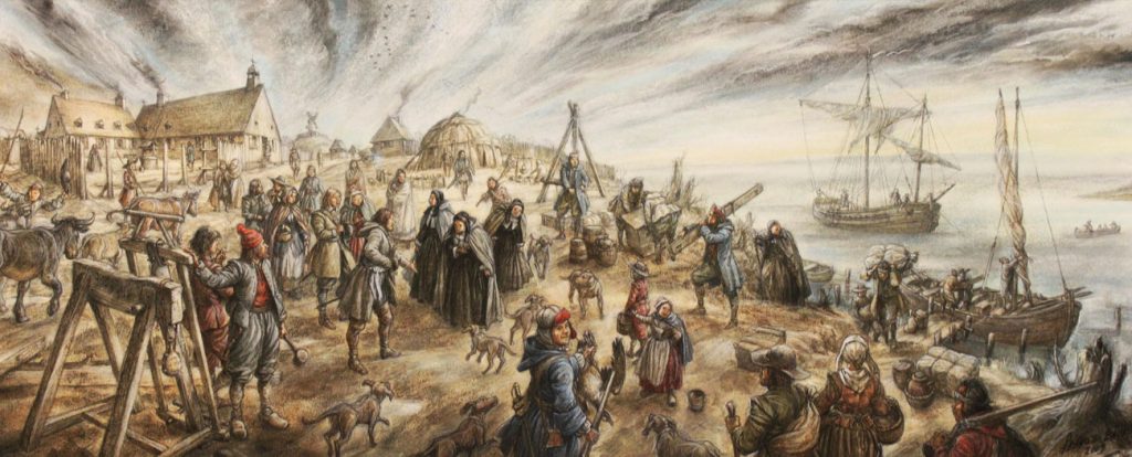 L’arrivée des Hospitalières de Saint-Joseph à Montréal le 20 octobre 1659 (Francis Back, Canada, 2009, Crayons et aquarelle sur papier, Collection des RHSJM, 2012.A.45)