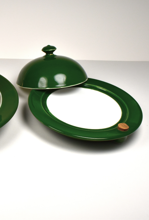 L’assiette-réchaud est munie d’un réservoir pour contenir l’eau bouillante et d’un couvercle, ainsi la nourriture pouvait demeurer chaude durant quelques heures.