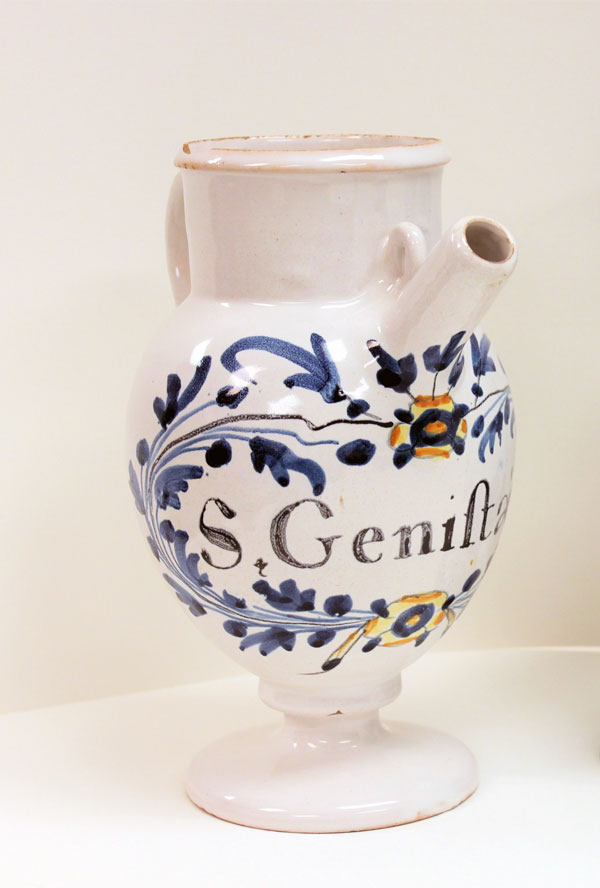 La chevrette est un pot à pharmacie muni d’un bec, qui servait à contenir des liquides comme les sirops, le miel ou les huiles. Le pot canon est un haut vase droit qui permettait de conserver les remèdes solides comme les baumes ou les onguents.