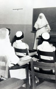 Sister Vézina giving a class at the School of Nursing (Canada, about 1945, RHSJM Archives)