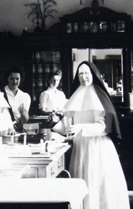 Sister Phaneuf in the Hôtel-Dieu pharmacy (Canada, 1944, RHSJM Archives)
